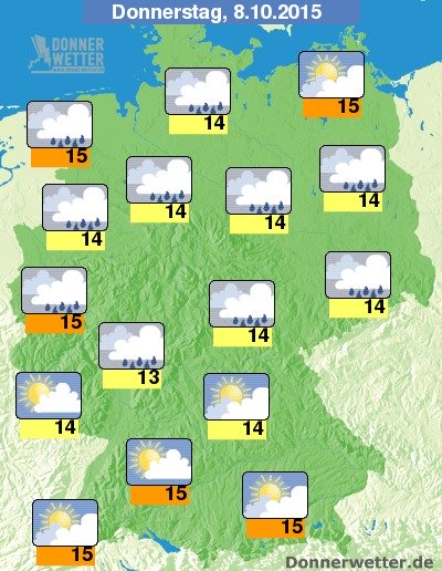 Am Donnerstag kann sich im Süden bei oft lockerer oder aufgelockerter Bewölkung vielerorts die Sonne zeigen, dazu bleibt es hier weitgehend trocken. In den nördlicher gelegenden Landesteilen ziehen hingegen überwiegend dichte Wolken durch und es fällt auch immer wieder, teils auch langanhaltender Regen. Im äußeren Nordosten Deutschlands kann die Bewölkung öfters auflockern, hier bleibt es weitgehend trocken. Die Temperatur steigt auf 13 Grad am Westerwald und bis etwa 15 Grad im Breisgau.