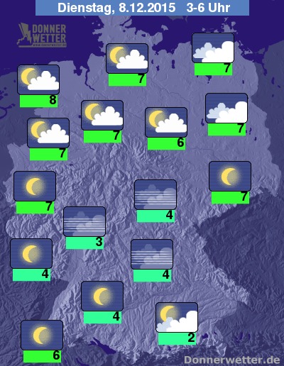 In der kommenden Nacht ist es zunächst vor allem über der Nordhälfte noch oft aufgelockert und teils stark bewölkt, jedoch trocken, im übrigen Land ist es bereits meist sternenklar und im weiteren Verlauf klart der Himmel auch über der breiten Landesmitte meist auf. Im Norden bleibt es jedoch bis zum Morgen hin bei einigen Wolken, dazu ist es weiterhin trocken. Die Tiefstwerte liegen bei 8 Grad in Papenburg und etwa 2 Grad in Nürnberg. Stellenweise bildet sich Nebel oder Hochnebel.