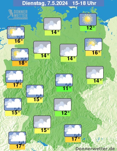 In den Nachmittagsstunden zeigt sich der Himmel überwiegend wechselnd oder stark bewölkt, dabei muss von Westen über die Mitte bis nach Sachsen mit Schauern gerechnet werden, auch einzelne Gewitter sind möglich. Länger anhaltend regnerisch bleibt es auch südlich der Donau. Im Nordwesten und Nordosten bleibt es bei teils auch freundlicheren Abschnitten meist trocken.