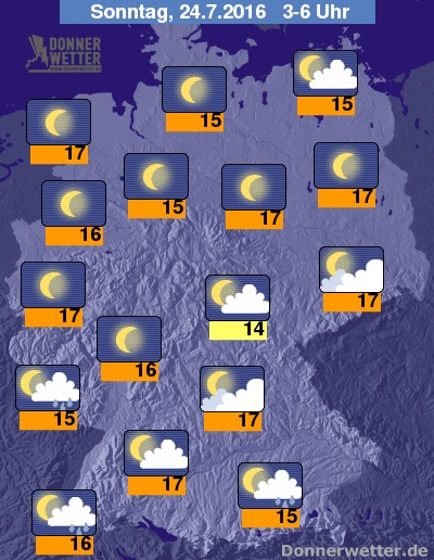 In der kommenden Nacht ist es vor allem im Süden noch meist stark, teils aufgelockert bewölkt und es bilden sich gebietsweise Schauer und lokale Gewitter. Über der Nordhälfte zeigt sich der Himmel größtenteils sternenklar und sonst locker bewölkt, hier bleibt es trocken. Die Temperatur sinkt auf 17 Grad in Berlin und 14 Grad im Thüringer Becken.