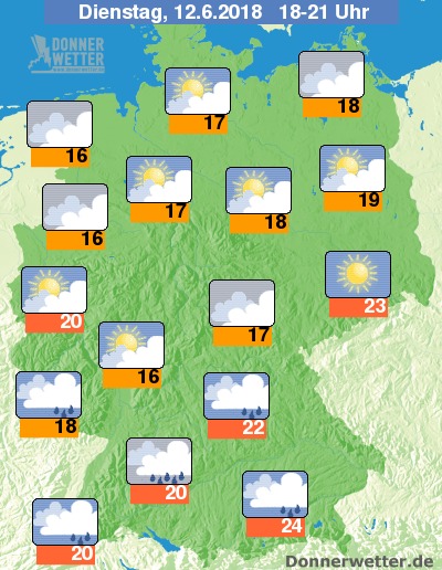 Heute Abend ist es über dem Norden und Osten bei wechselnder bis starker Bewölkung weiterhin trocken. Im übrigen Bundesgebiet halten sich dagegen dichte Wolken, dabei bilden sich über dem Süden zum Teil kräftige Schauer und Gewitter, sonst fällt gebietsweise Regen. Die Temperatur liegt bei 16 Grad im Westerwald und um 24 Grad im Raum München.