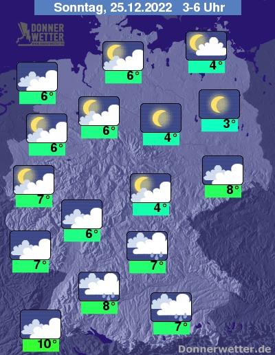 In der kommenden Nacht auf den 1. Weihnachtsfeiertag klingen auch die Regenfälle im Süden nach und nach ab und bei überwiegend starker, über der Nordhälfte gebietsweise aufgelockerter Bewölkung bleibt es trocken. Im Osten wird es teilweise auch sternenklar. Die Temperatur sinkt auf 10 Grad in Freiburg und etwa 3 Grad in Berlin. An den Küsten weht ein anfangs starker und teilweise stürmischer Wind.