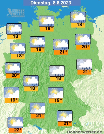 Am Dienstag ist es wechselnd bis stark bewölkt, im Süden zeigen sich oft auch heitere Abschnitte, hier bleibt es trocken. Im übrigen Land bilden sich gebietsweise Schauer. Di Temperatur steigt auf 18 Grad in Bremerhaven und bis 22 Grad in Freiburg. An den Küsten herrscht zum Teil Sturm.