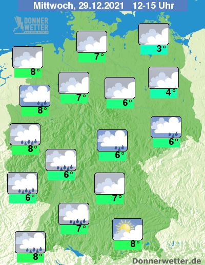 Heute Nachmittag bleibt es weitgehend bedeckt, vor allem über der Osthälfte ist es oft auch neblig-trüb, jedoch weitgehend trocken. Über der Westhälfte fällt zeitweise Regen. Die Temperatur liegt bei 3 Grad an der Müritz und bis 8 Grad am Rhein.