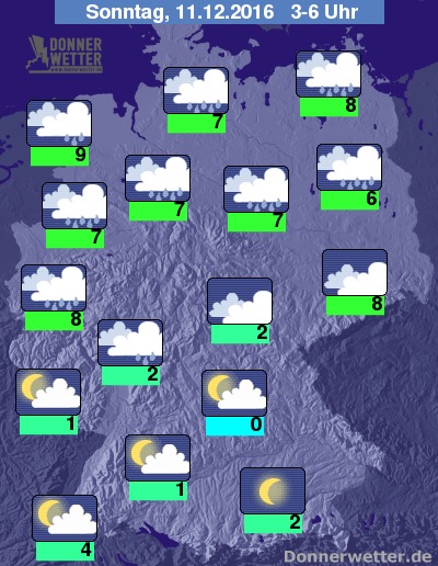 In der Nacht zum Sonntag fällt zunächst über der Nordhälfte Deutschlands verbreitet Regen bei weitgehend dichter Bewölkung. Die dichten Wolken und der Regen breiten sich zum Morgen dann auch weiter ins nördliche Badenwürttemberg und Bayern aus. Im Alpenvorland bleibt es hingegen meist locker oder wechseld bewölkt und trocken. Die Temperatur sinkt auf 9 Grad an der Nordsee und bis auf 0 Grad in Mittelfranken.