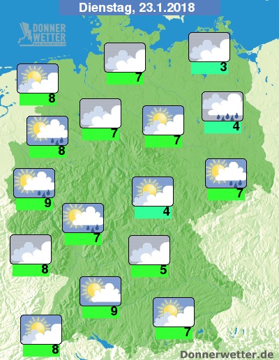 Am Dienstag zieht häufig starke, hier und da aber auch aufgelockerte Bewölkung durch, dabei regnet es bevorzugt am Vormittag im Osten und Nordosten und nachmittags im Westen der Republik, sonst bleibt es weitgehend trocken. Die Temperatur steigt auf 3 bis 9 Grad.