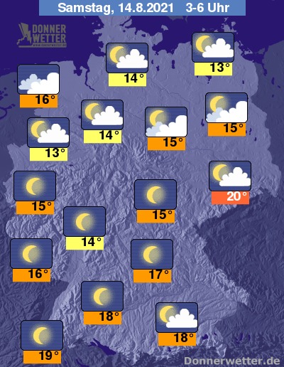 In der kommenden Nacht ist der Himmel über dem Land verbreitet sternenklar, im Norden ist es oft locker bis wechselnd bewölkt, in Küstennähe ist es auch oft stark bewölkt. An der Nordsee sind einzelne Schauer möglich, sonst bleibt es trocken. Die Temperatur sinkt auf 20 Grad in Dresden und bis 13 Grad in Münster.