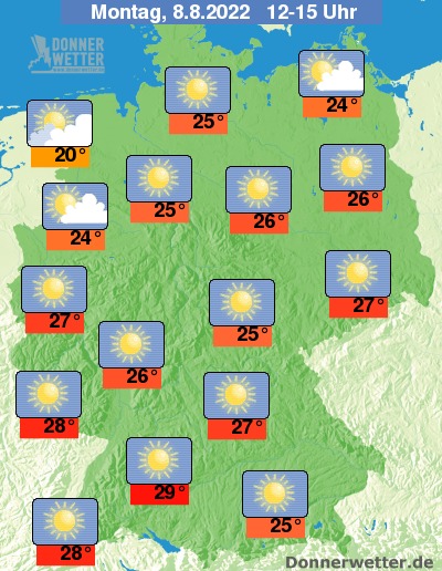 Heute Abend ziehen an den Küsten oft einige, teils dichte Wolkenfelder durch. Über der Südhälfte ist es verbreitet sonnig und im übrigen Land heiter bis sonnig. Es bleibt trocken bei 21 Grad in Wilhelmshaven und bis 30 Grad in Stuttgart.