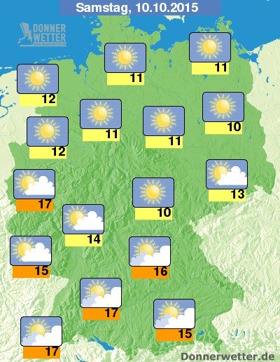 Am Samstag präsentiert sich die Nordhälfte Deutschlands, nach Auflösung einzelne Nebel- oder Hochnebelfelder, verbreitet sonnig. Weiter nach Süden hin ziehen hingegen auch öfter einige Wolken durch, dazwischen kann sich aber auch immer wieder die Sonne zeigen und gebietsweise ist es auch heiter oder sonnig. Am Alpenrand ist hier und da etwas Regen möglich, sonst bleibt es aber überall trocken. Die Temperatur steigt auf 10 Grad in Eberswalde und bis 17 Grad im Oberrheingraben.
