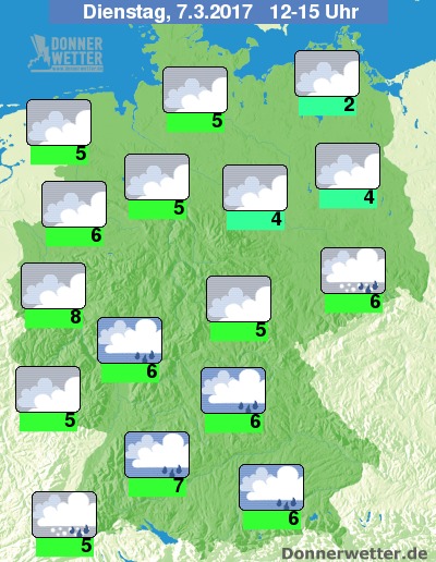 Heute Nachmittag bleibt die Wolkendecke über dem Land weitestgehend verschlossen, dazu fällt bevorzugt über der Südhälfte Deutschlands zeitweise Regen, hier und da ist auch Graupel, Schneeregen oder Schnee möglich. Weiter nach Norden hin bleibt es dagegen zum Großteil trocken. Die Temperatur liegt bei 2 Grad in Stralsund und etwa 8 Grad im Rheinland.