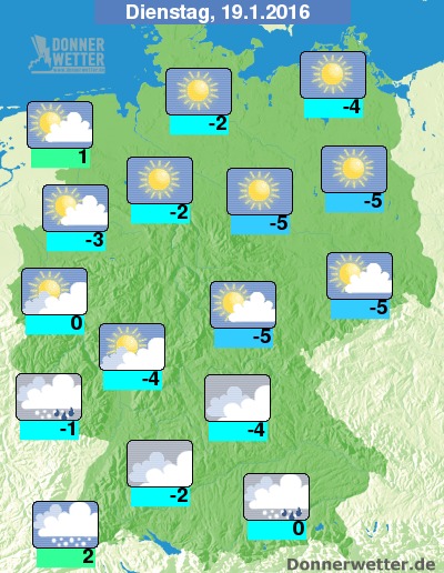 Heute ziehen im Südwesten und im Alpenvorland dichte Wolken durch und es kann zeitweise schneien, örtlich ist auch Schneeregen möglich, dabei besteht erhöhte Glättegefahr! Nördlich des Mains ist es dagegen meist heiter bis sonnig und es bleibt trocken. Hier und da sind aber auch mal mehr Wolken möglich. Die Temperatur steigt auf -5 Grad in Berlin und bis 2 Grad in Freiburg.
