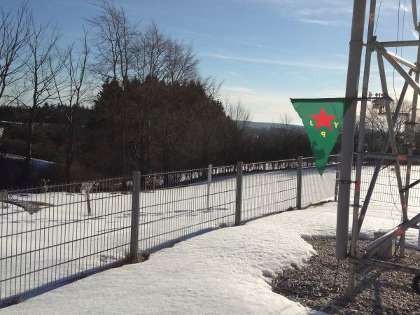 Sonne und Wolken begleiten uns zum Sonntagskaffee. Am intern. Frauentag lacht die Sonne auch bei unserer Wetterstation am Weißen Stein in der Eifel mit Flagge der Verteidigerinnen von Kobane.