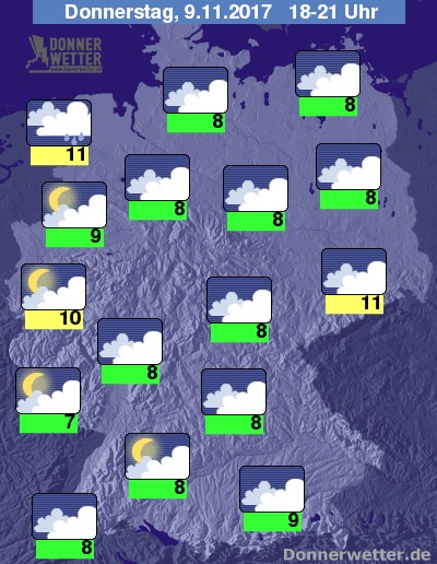 Bis zum Abend wird die Wolkendecke auch im Norden immer dichter und in Nordseenähe regnet es mitunter auch leicht. Die Sonne kommt am späten Nachmittag höchstens noch entlang des Rheins für kurze Zeit zum Vorschein.
