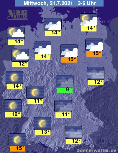 In der folgenden Nacht bleibt es über dem Norden zumeist stark bewölkt, hier und da ist es auch aufgelockert bewölkt, dazu bleibt es weitgehend trocken. Weiter nach Süden hin ist der Himmel hingegen sternenklar und es bleibt trocken. Die Temperatur sinkt auf 15 Grad in Magdeburg und bis 9 Grad in Jena.