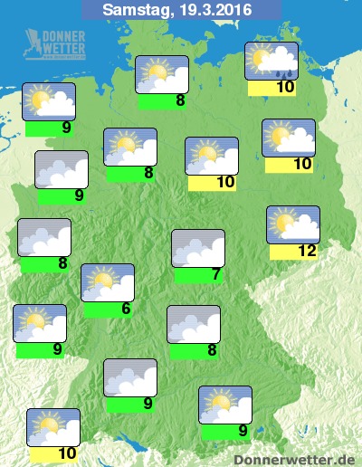 Zumindest bleibt der Samstag noch weitgehend trocken, jedoch ziehen immer wieder auch dichte Wolken durch, dazwischen kann sich aber auch zeitweise mal die Sonne zeigen. Es werden 6 bis 12 Grad erreicht.