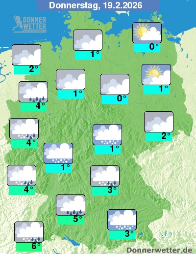 Am Mittwoch zeigt sich das Wetter meist stark bewölkt, vor allem im Norden können sich zum Teil Auflockerungen zeigend. Vor allem über der Osthälfte, aber auch im Südwesten fällt zeitweise Schnee oder Regen, sonst bleibt es zumeist trocken. Die Höchstwerte erreichen -1 Grad in der Magdeburger Börde und bis 4 Grad am Oberrhein.