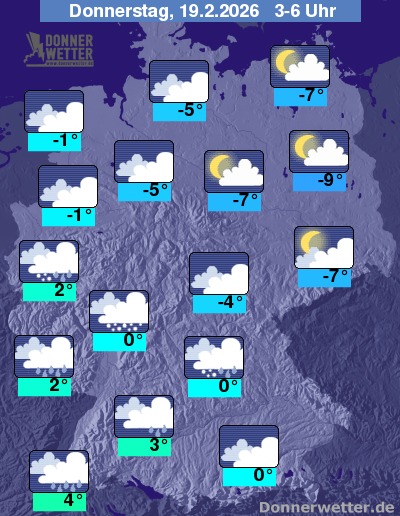 In der Nacht zum Mittwoch zeigt sich der Himmel überwiegend dicht bewölkt, dazu fällt besonders vom Norden und in den Osten und in den Norden Bayerns Schnee, teilweise auch Schneeregen. Im übrigen Bundesgebiet bleibt es meist trocken. Die Tiefstwerte liegen bei 1 Grad in Dresden und bis -5 Grad in Neubrandenburg.