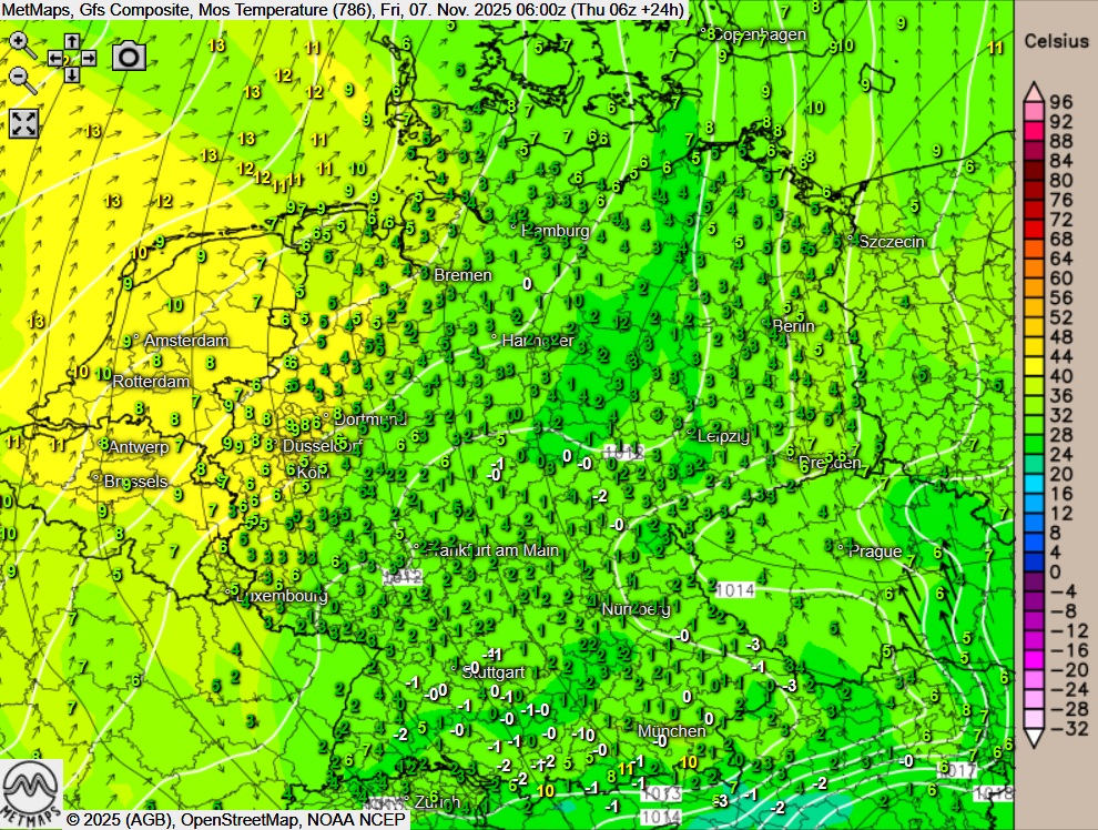 Die Temperaturen erreichen am Nachmittag Höchsttemperaturen um 10 bis 16 Grad, im Dauernebel teils nur Werte um 4 bis 8 Grad.