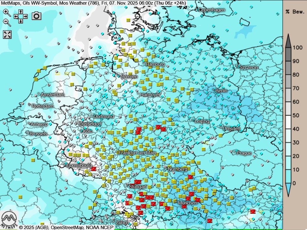Am Freitag kann sich zunächst teils zäher Nebel oder Hochnebel halten. Nach Auflösung gibt es heute vor allem im Westen und Osten sowie im Bergland erneut viel Sonnenschein. Es bleibt niederschlagsfrei.