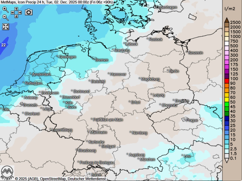 Am Dienstag im Nordwesten stark bewökt, dabei zeitweise Regen oder Sprühregen. Sonst teils nebelig-trüb, teils heiter und trocken. Höchstwerte um 5 bis 7 Grad.