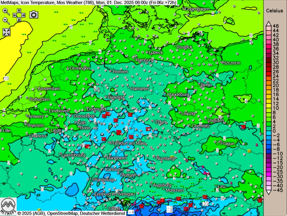 Die Temperaturen erreichen Höchstwerte um 4 bis 9 Grad.