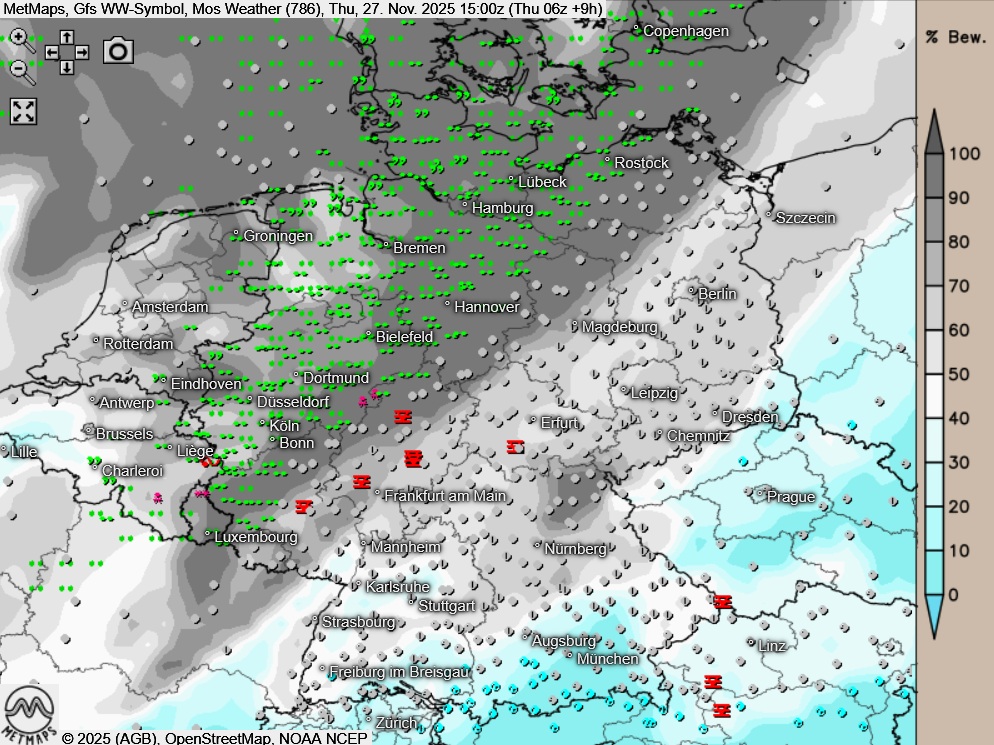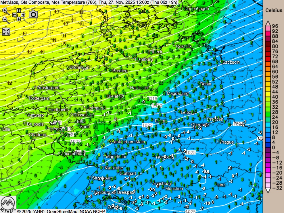Die Strömungs- / Temperatur- sowie die Wetterkarte für Donnerstagnachmittag nach GFS: