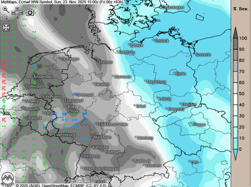 Am Sonntagnachmittag zeigt sich der Himmel über der Westhälfte Deutschlands stark bewölkt oder der Himmel ist bedeckt, dabei muss gebiets- und zeitweise mit Schneeregen oder Schnee gerechnet werden. Vorsicht Glättegefahr! In der Osthälfte ist es nach Nebelauflösung meist heiter oder sonnig und es bleibt trocken.