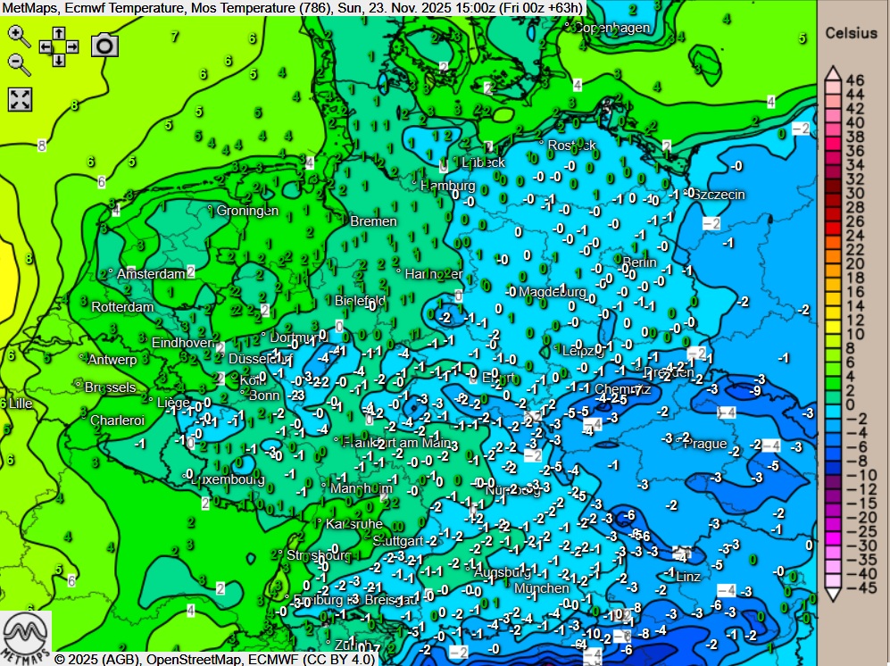 Die Temperatur- und Wetterkarte für Sonntagnachmittag (15:00 Uhr) nach ECMWF: