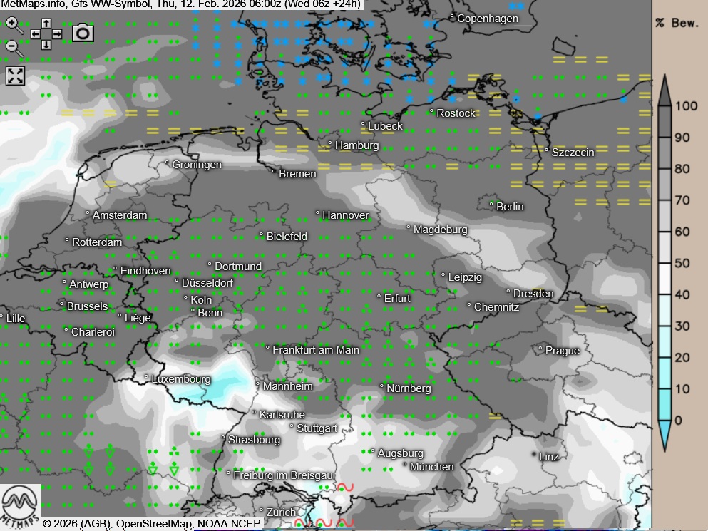 Am Donnerstag (Weiberfastnacht) zeigt sich der Himmel über den meisten Landesteilen  stark bewölkt, dabei fällt vor allem in den Staulagen der Mittelgebirge teils ergiebiger Regen, im äußersten Norden und Nordosten auch Schnee. Es ist windig bis stürmisch, in den Höhenlagen auch Sturm oder schwerer Sturm.