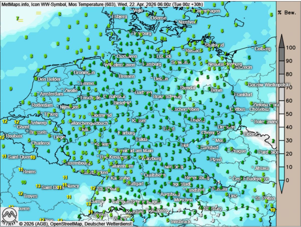 In den Nächten bleibt es jedoch weiterhin frisch: Die Temperaturen sinken auf etwa 2 bis 5 °C ab. Insgesamt dürfen wir uns auf eine stabile und freundliche Wetterphase freuen – ideal für Aktivitäten im Freien.