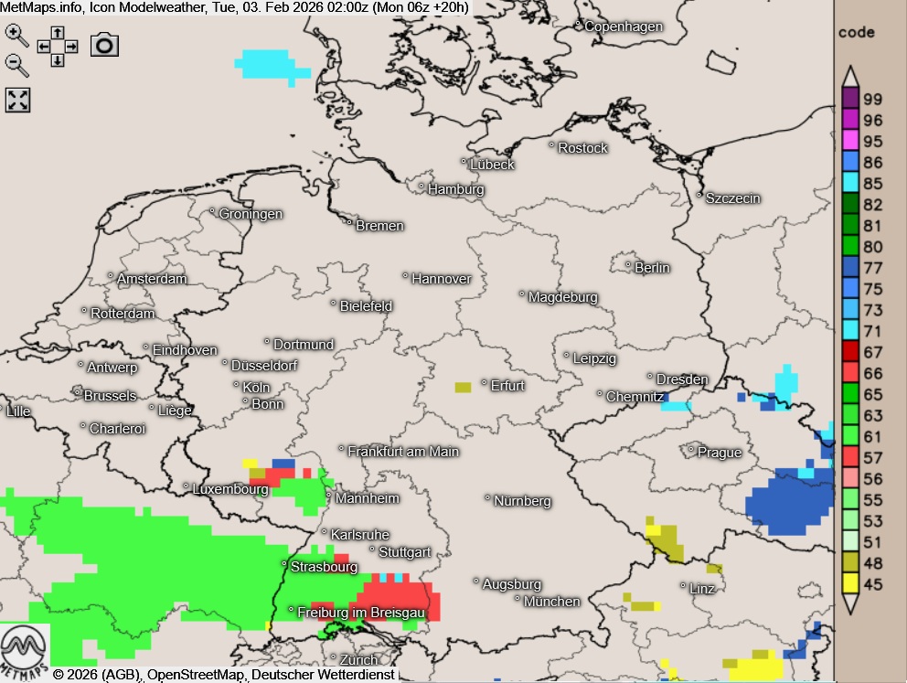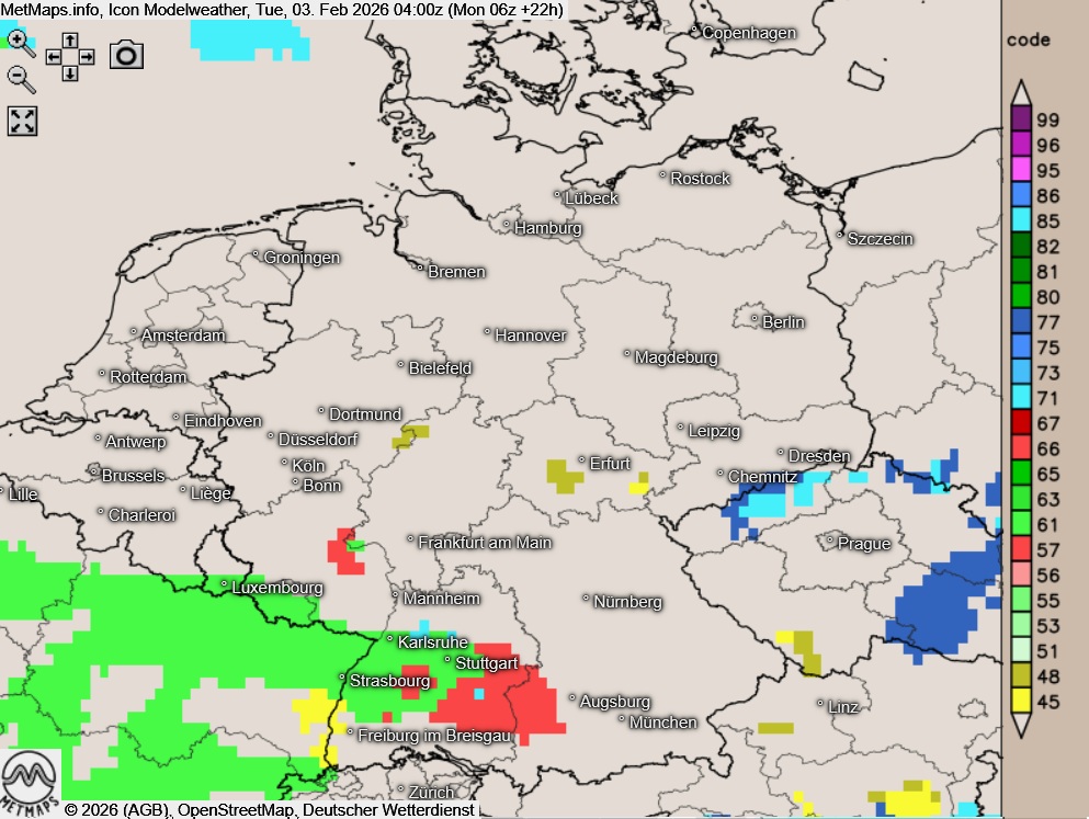 Die Wetterkarten für 02:00, 04:00 und 06:00 Uhr nach ICON mit gefrierendem Regen (rot) im Westen und Südwesten