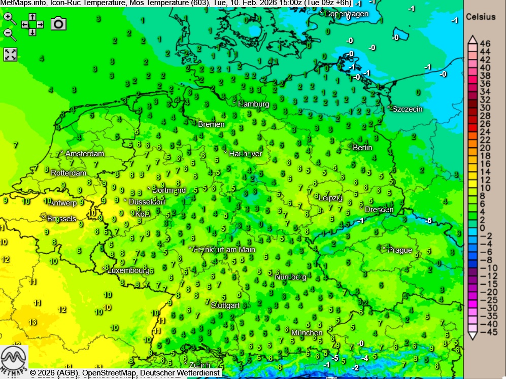 Die Temperatur- und Wetterkarte nach ICON-RUC für 15:00 Uhr: