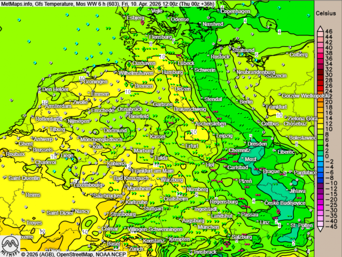 | Ein Hoch über der Ostsee lenkt von Nordosten trockene und vor allem in den Osten und Nordosten auch sehr kühle Luft. Weiter nach Westen und Südwesten strömt aus östlichen Richtungen deutlich wärmere Luft. |