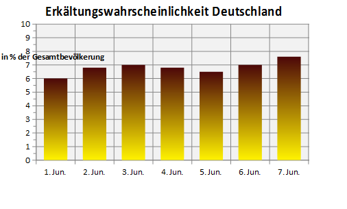 Im Vergleich zu den langjährigen Mittelwerten sind die Menschen zur Zeit häufiger krank: Aktuell liegt der Bevölkerungsanteil von Menschen, die mit einer Erkältung oder Grippe zu kämpfen haben bei 7-8 % - "normal" sind Werte um 5%.