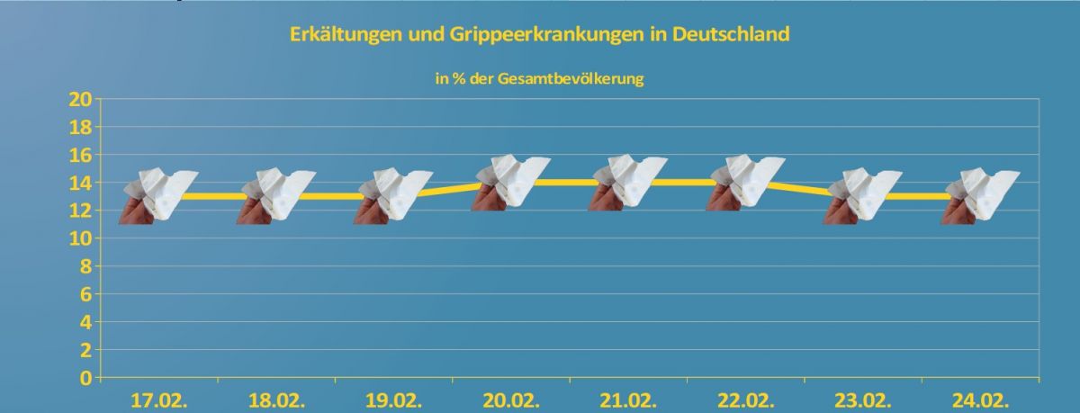 Mit dem Einfließen deutlich wärmerer Luft in der zweiten Wochenhälfte sinkt der Anteil der Erkältungs- und Grippeerkrankten im Land auf etwa 12 Prozent.
