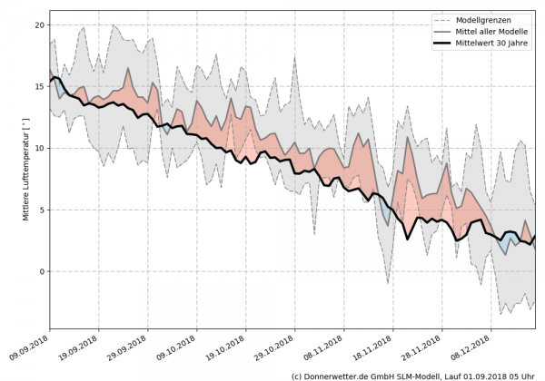 Leider erwartet uns in den kommenden Tagen eine Durchschnittstemperatur von nur 15 Grad und weniger. Doch lasst euch davon nicht beunruhigen, denn die Nächte zählen dazu und auch heute ging das Thermostat schnell mal unter 10 Grad C. Der September wird hinsichtlich der Grafiken recht trocken ausfallen aber bedeckt.