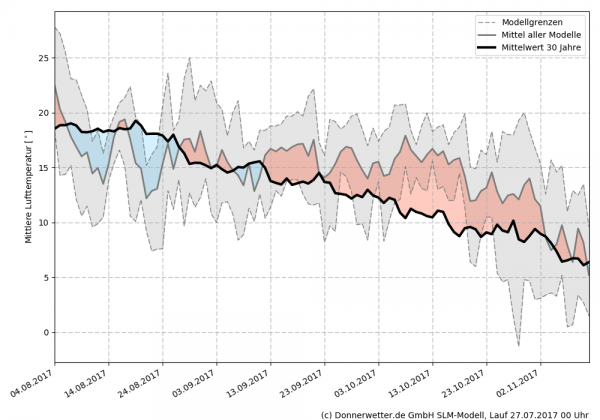 Dem Süden stehen wechselhafte Wochen bevor. Bis Anfang November, so weit berechnet unser Prognosemodell zur Zeit, kündigen sich viele feuchte Tage an. Dennoch macht sich zwischendurch auch immer wieder die Sonne bemerkbar und die mittleren Lufttemperaturen liegen vor allem ab Mitte September zum Teil deutlich über den langjährigen Mittelwerten.