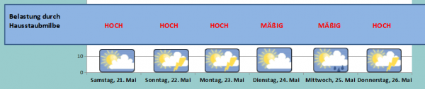 Nicht nur Zecken finden an diesem Wochenende ein optimales Feuchte- / Temperaturmillieu vor: Auch Hausstaubmilben lieben den Mix aus hoher Luftfeuchtigkeit und warmen Temperaturen.