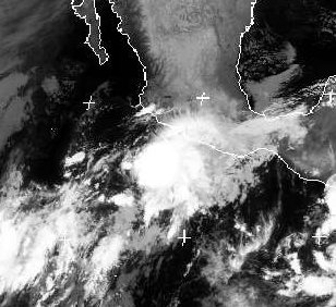 Über dem Pazifik, vor der mexikanischen Küste, etwa westlich von Acapulco, liegt der tropische Sturm 'Sergio'. Seine mittleren Windgeschwindikeiten erreichen nur noch etwa 85 km/h. Er schwächt sich weiter ab, während er langsam nordwestwärts zieht. (Bildquelle: NERC Satellite Receiving Station, Dundee University, Scotland, http://www.sat.dundee.ac.uk/)
