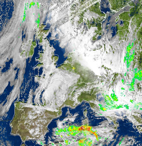 Das Satellitenbild von heute Nachmittag zeigt vor allem über dem westlichen Mittelmeerraum oft kompakte Wolken, die hier für zum Teil kräftige Schauer sorgen, vereinzelt sich auch kurze Gewitter möglich. Oft unbeständig und nass ist es auch rund um die Adria und auf dem Balkan, unter weitgehend dichten Wolken fällt hier zum Teil langanhaltender Regen.