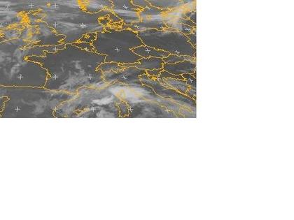 Unter Hochdruckeinfluss sind weite Teile von Mitteleuropa nahezu wolkenfrei. Im westlichen Mittelmeerraum bringt ein Tief teils kräftige Schauer und Gewitter. Diese Schauer- und Gewitterwolken sind auf dem Satellitenbild von Montag früh gut zu erkennen. (Bildquelle: EUMETSAT)