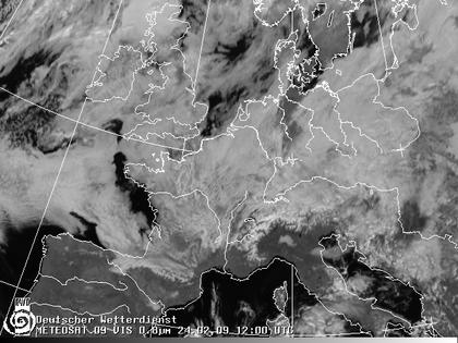 Trotzdem sich über den Britischen Inseln heute das Hoch 'Irina' befindet, zeigt das Satellitenbild viele dichte Wolken. Häufig handelt es sich dabei um flache hochnebelartige Bewölkung. Größere Wolkenlücken findet man dagegen am Mittelmeer, wo die Temperaturen höher sind und sich Hochnebel nur noch schlecht bilden kann.