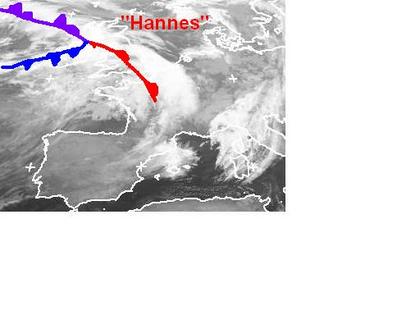 Das Tief 'Hannes' liegt zurzeit über Irland. Seine Ausläufer sind auf dem Satellitenbild von Donnerstag früh gut zu erkennen. Vor allem seine Warmfront wird heute auch noch Deutschland erreichen und teils kräftigen Regen bringen. (Bildquelle: NERC Satellite Receiving Station, Dundee University, Scotland, http://www.sat.dundee.ac.uk/)