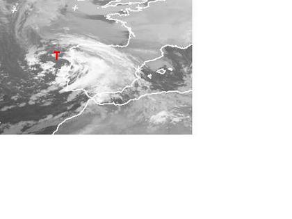 Auf dem Satellitenbild von Samstag früh ist ein Tief westlich der Iberischen Halbinsel gut zu erkennen. Seine Ausläufer sorgen heute in Spanien und Portugal für meist dichte Wolken und Regen, teils sind auch Gewitter möglich. (Bildquelle: NERC Satellite Receiving Station, Dundee University, Scotland, http://www.sat.dundee.ac.uk/)