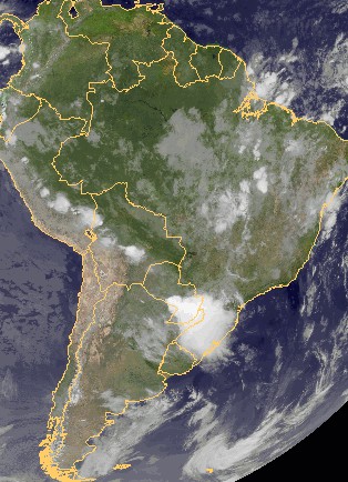 Das Foto zeigt eine Aufnahme Südamerikas von heute Nachmittag. Dabei ist über dem südlichsten Brasilien ein kräftiges Tief zu erkennen, das dort mit hochreichender Quellbewölkung für verbreitet kräftigen, ergiebigen und teils gewittrigen Regen sorgt. Auch sonst entwickeln sich vor allem über Brasilien gebietsweise Schauer oder Gewitter.
