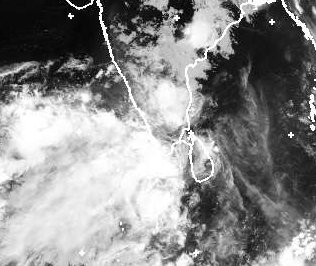 Im Süden von Indien fallen bei starke Bewölkung teils kräftige Gewitter. Dieses sind wohl die ersten Anzeichen des im Juni/Juli durch die Verlagerung der Innertropischen Konvergenzzone (ITC) und der daraus resultierenden Passatumlenkung beginnenden Sommermonsun. (Quelle: http://www.sat.dundee.ac.uk)