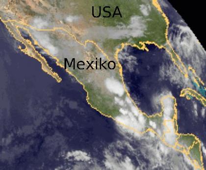 Viele Gewitterzellen haben sich heute vor allem über dem südlichen Mexiko gebildet. Die Wolken erreichen dabei große Höhen, wie sich an der weißen Färbung der Wolken erahnen lässt. Weiter nach Nordwesten sind in Mexiko dagegen nur vereinzelt Schauerwolken vorhanden, dafür ist es hier bei fast 40 °C zum Teil sehr heiß.