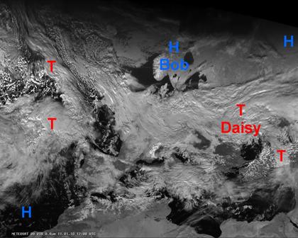 Auf dem heutigen Satellitenfoto zeigt sich das sich langsam abschwächende Tief 'Daisy' über Osteuropa, dort sorgt es weiterhin für teils anhaltende Schneefälle, die gebietsweise auch noch stärker ausfallen. Tiefdruckeinfluss sorgt ebenfalls über Großbritanien für teils Schnee, zunehmend aber auch für Regen. Auch im westlichen und zentralen Mittelmeer kommt es bei meist vielen Wolken zu einzelnen Schauern. Dagegen ist es im Norden des Kontinents unter Hochdruckeinfluss häufig trocken oder es fällt nur etwas Schnee.