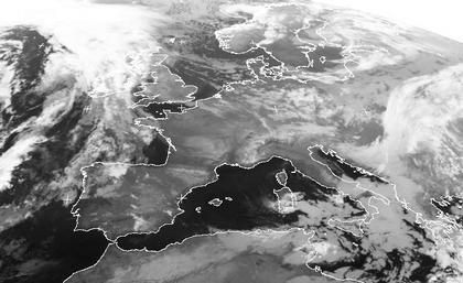 Das Satellitenbild zeigt ein Hochdruckgebiet über Frankreich, das in weiten Teilen Mitteleuropas freundliches Wetter bringnt; von Nordwesten her ziehen noch einzelne Schauer nach Deutschland hinein. Über Schottland liegt die Warmfront eines Tiefs bei Island. Im östlichen Mittelmeer liegt ein weiteres Tief und saugt kalte Festlandskluft an, wodurch sich hier verbreitet Schauer und gelegentlich auch Gewitter bilden.