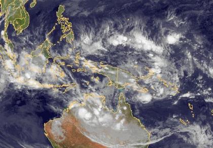 Über Indonesien und Neuguinea befindet sich z.Z. die innertropische Konvergenzzone. In ihrem Bereich treten schwere Schauer und Gewitter auf, deren Zellen deutlich auf dem Satellitenbild zu sehen sind.